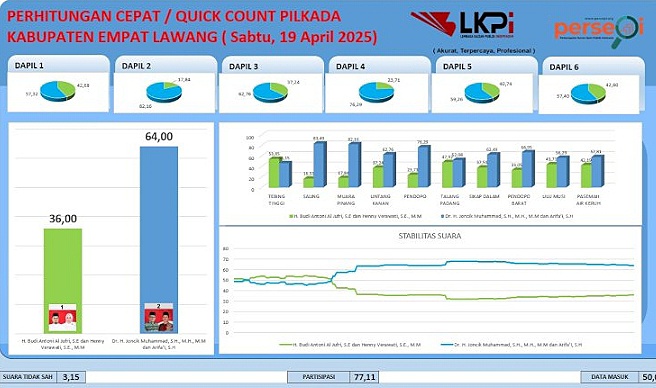 EMPAT LAWANG | SUM-SEL, aph88.com – Pasangan calon bupati dan wakil bupati Empat Lawang nomor urut 02 Joncik Muhammad – Arifai unggul disembilan kecamatan berdasarkan hitung cepat atau quick count yang diselenggarakan oleh Lembaga Kajian Politik Indonesia (LKPI), Sabtu (19/4/2025).