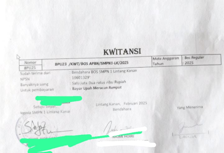 – Kegiatan Pembelajaran dan Ekstrakurikuler: Alokasi Rp12.637.500. Sebagian besar kegiatan yang tercatat tidak terlaksana, dan bukti pembelian perlengkapan ekstrakurikuler diduga tidak asli berdasarkan konfirmasi dengan beberapa siswa dan guru di Kecamatan Lintang Kanan.