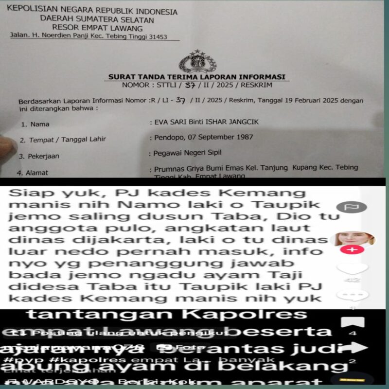 Empat Lawang | Sumsel, aph88.com – PJ Kemang manis kecamatan Tebing Tinggi atas Nama EVA SARI Pada hari Rabu,19 ,februari,2025 Resmi laporkan akun tik tok Mariana ke polres Empat Lawang terkait dugaan pecemaran nama baik melalui sosial media,